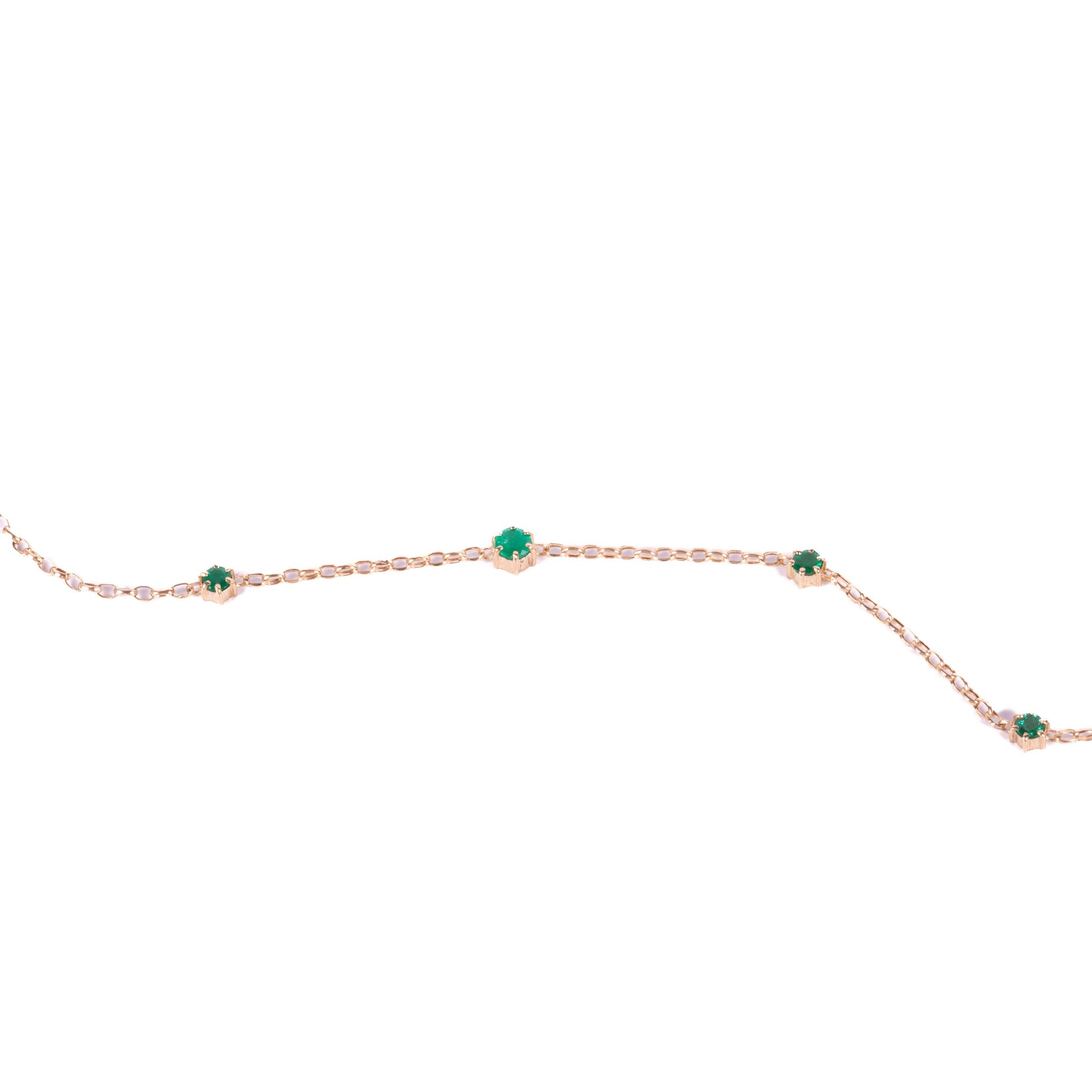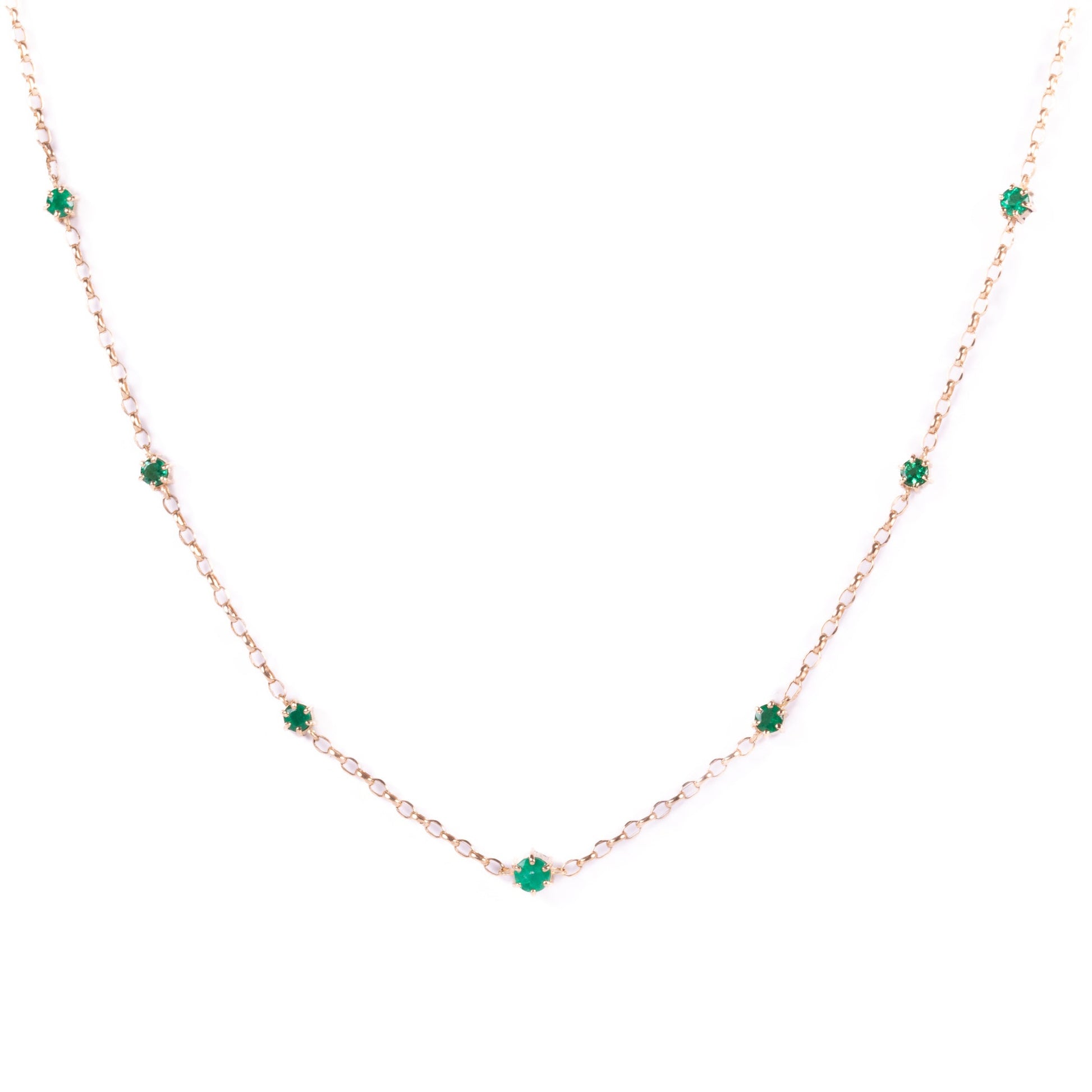 La gargantilla Armonía está elaborada en oro de 18 quilates, con esmeraldas colombianas finamente engastadas que parecen flotar sobre el oro, creando un brillo sutil y continuo alrededor del cuello.