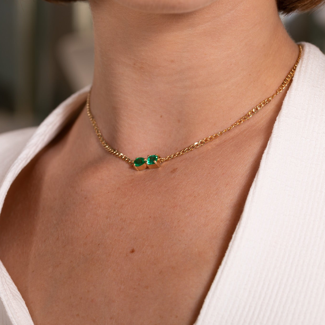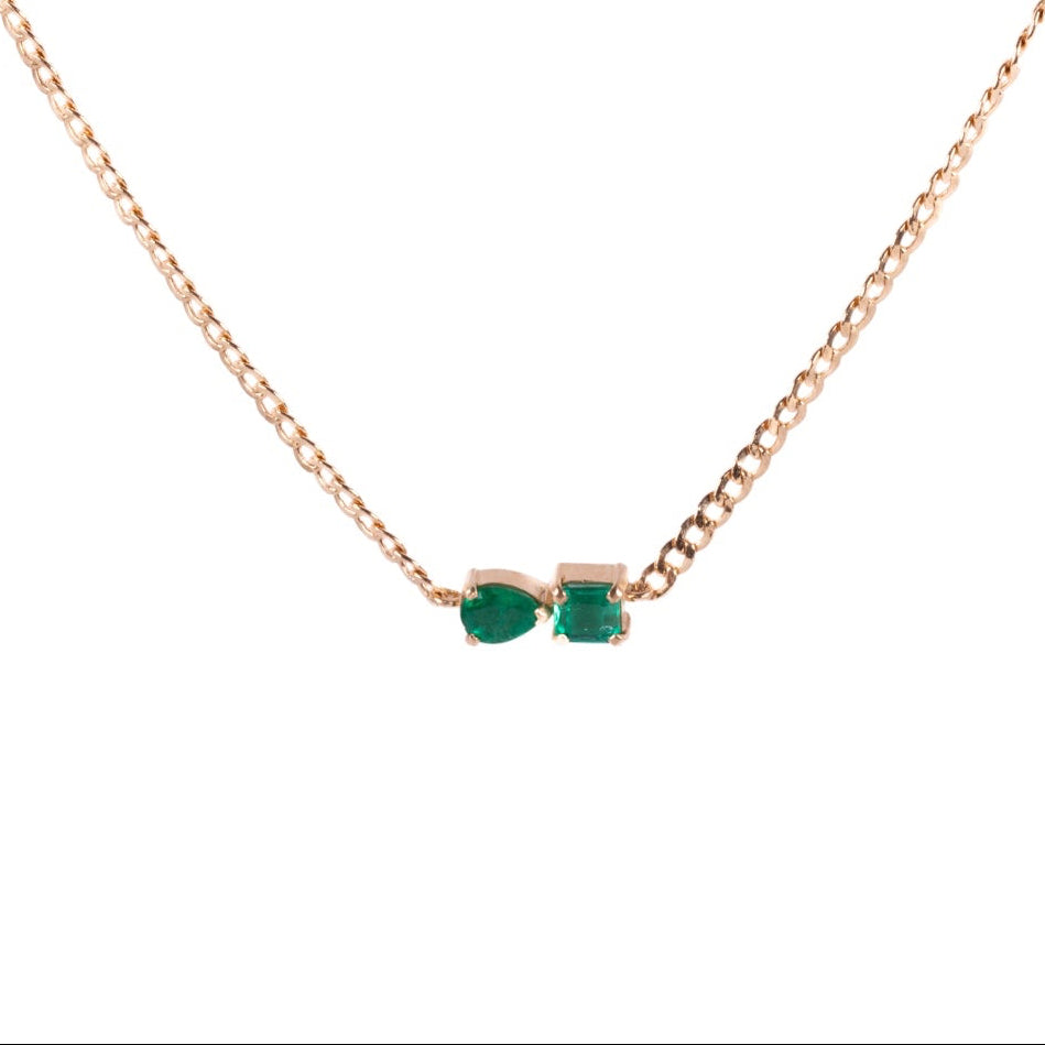 Gargantilla en oro de 18K con doble esmeralda natural. Un diseño delicado y sofisticado que aporta brillo y color con una elegancia sutil.