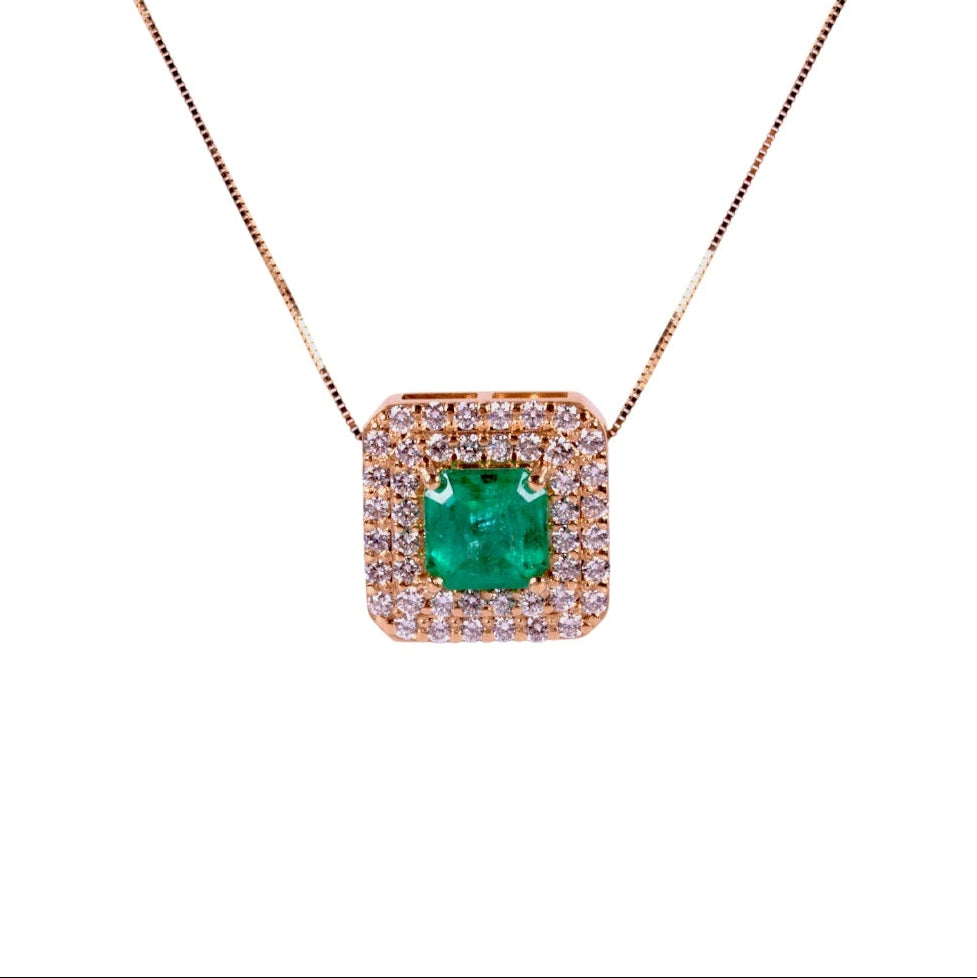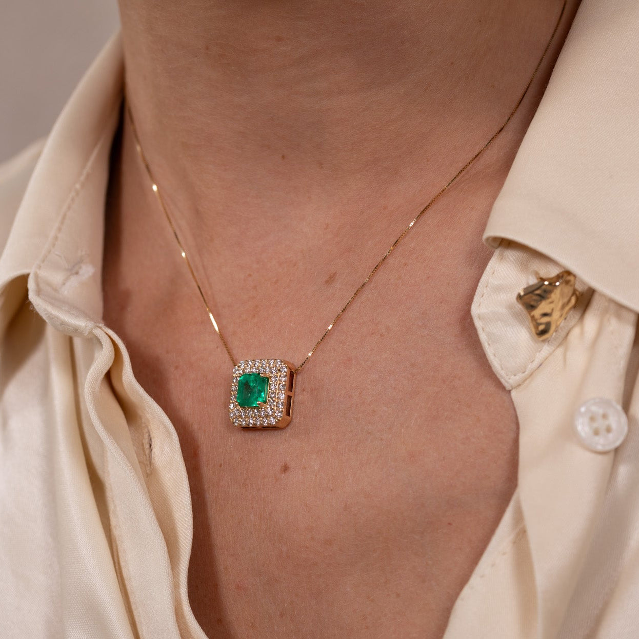 Gargantilla Halo Imperial en oro de 18K con esmeralda central rodeada de un delicado halo de diamantes. Una pieza sofisticada y atemporal que realza la elegancia natural de quien la lleva.