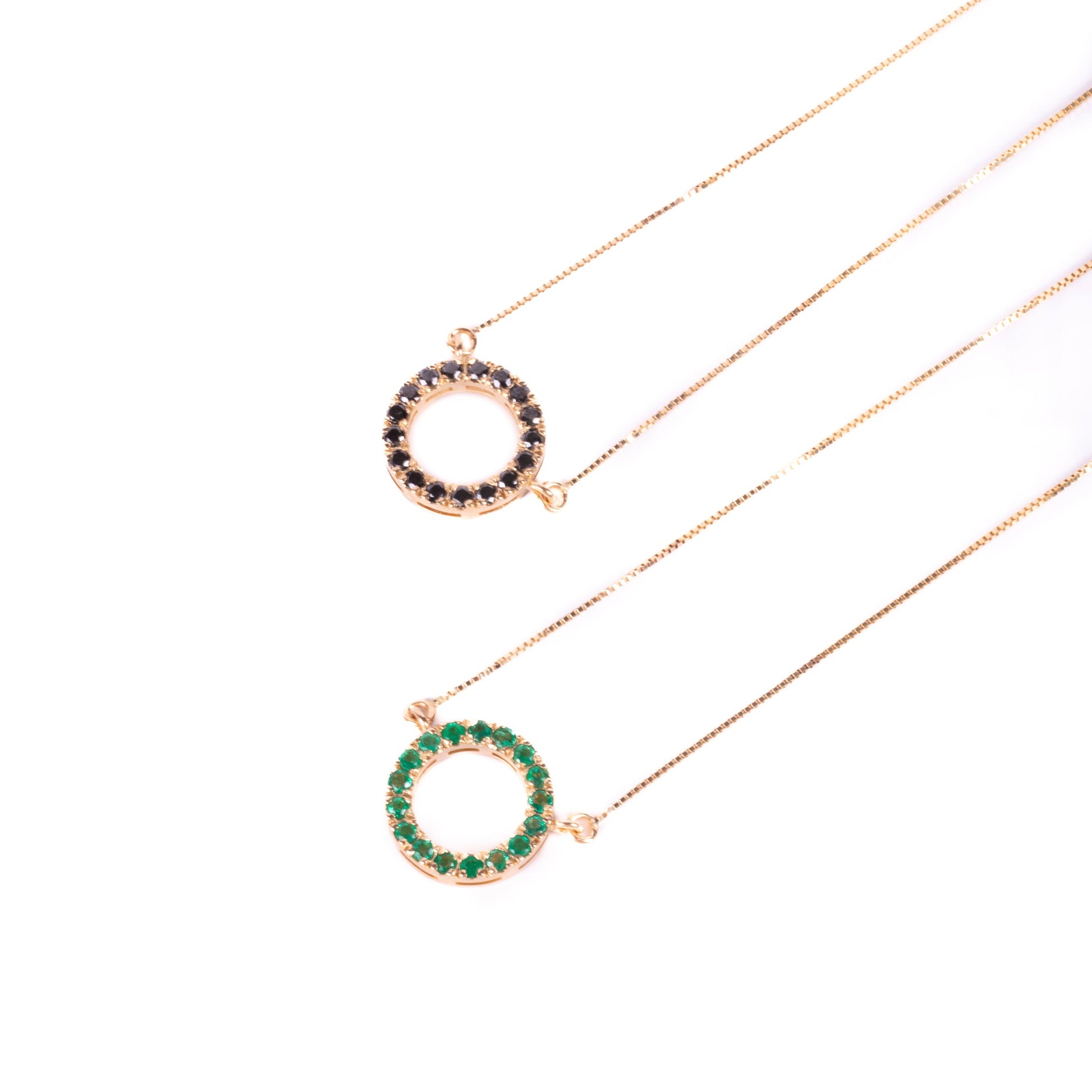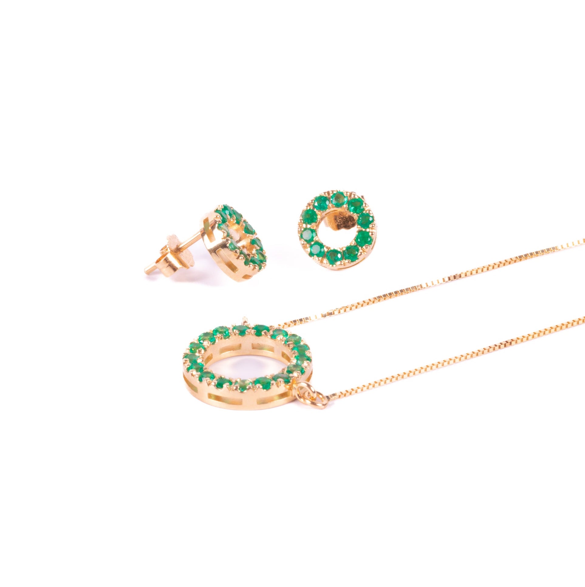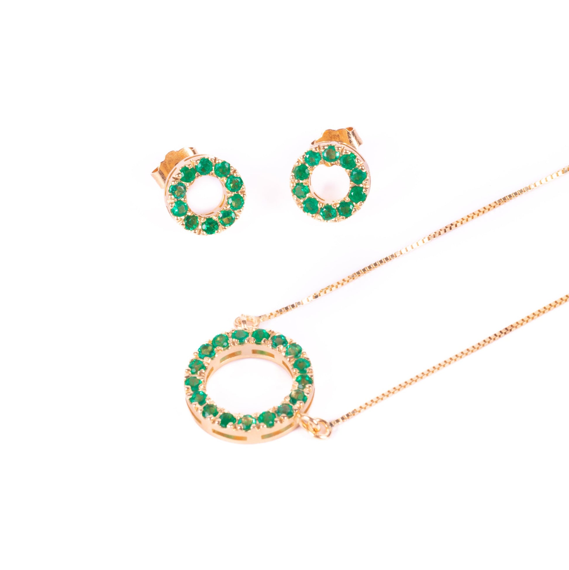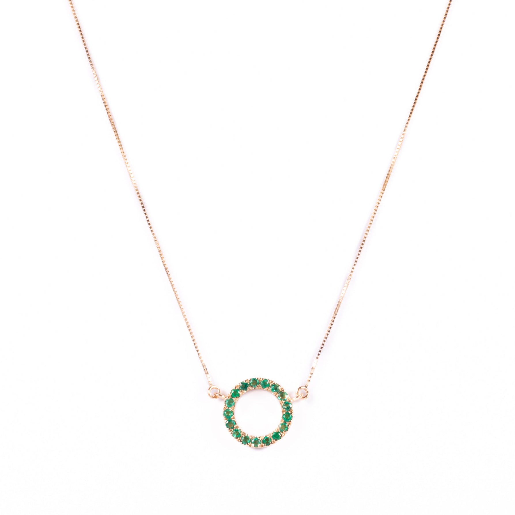 Elaborada en oro de 18 quilates, con esmeraldas finamente engastadas en un dije circular que simboliza la eternidad.