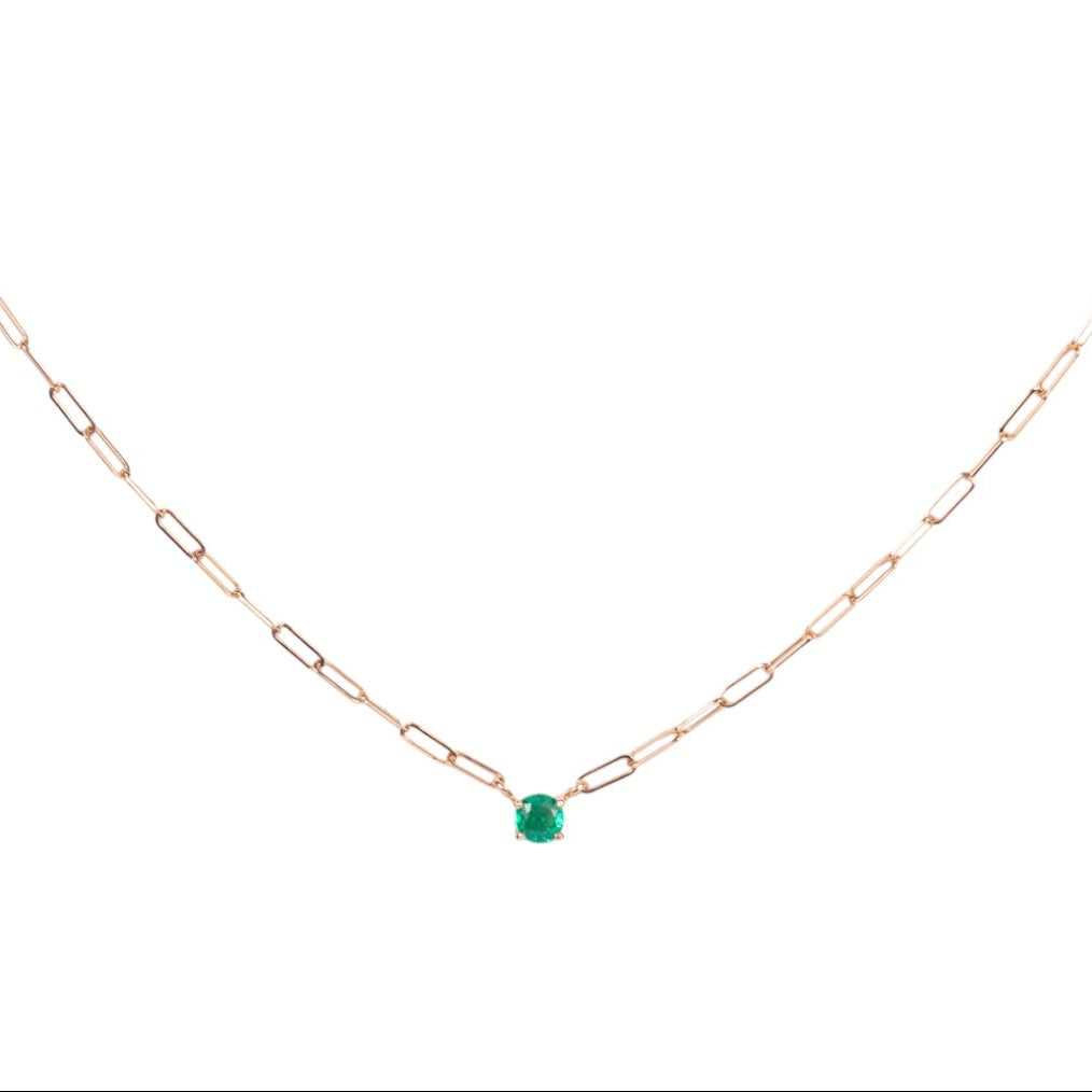 Gargantilla en oro de 18K con cadena tipo paper clip y esmeralda natural. Un diseño moderno y elegante que combina estructura y color con sutileza.