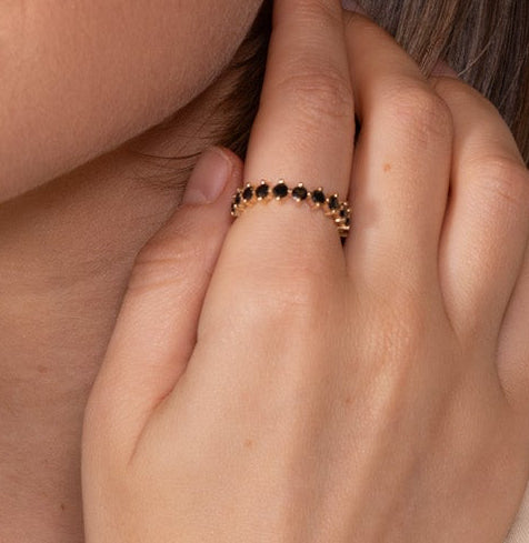 Anillo infinito en oro de 18k con diamantes negros, símbolo de eternidad y sofisticación. Su diseño atemporal y elegante lo convierte en la joya perfecta para cualquier ocasión.