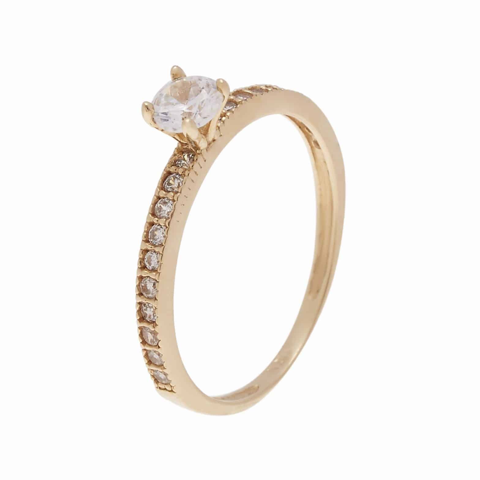 Anillo solitario en oro de 18 kilates circón central engastado en cuatro uñas y circones laterales.