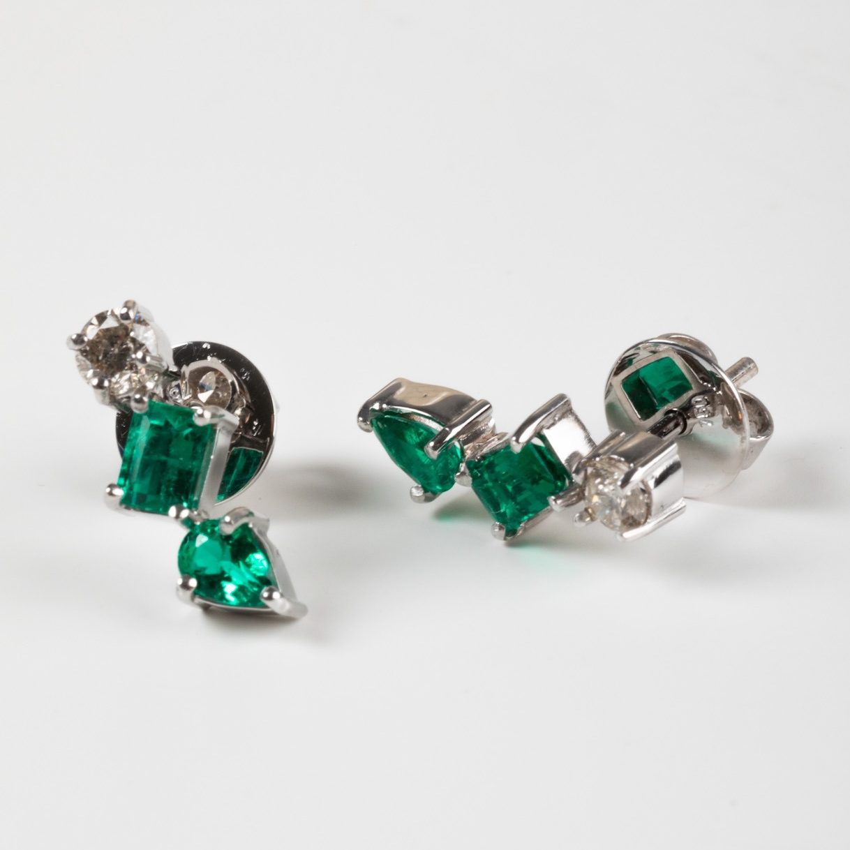 Aretes en oro blanco de 18 kilates con diamantes de 0.15cts cada uno (aproximadamente) y esmeraldas colombianas en total 0.80cts